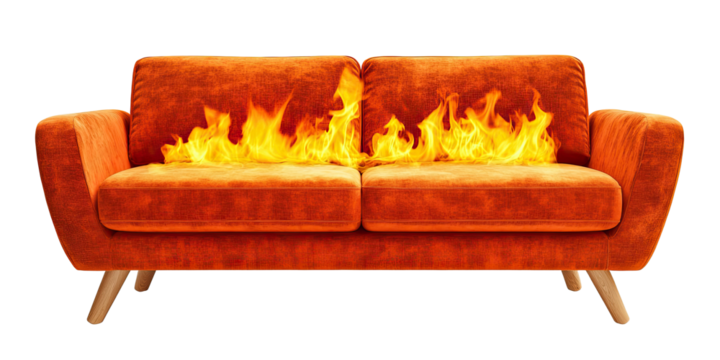 Sofa on fire, isolated on transparent background