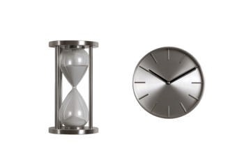 Modern sand hourglass with steel frame placed beside minimalist wall clock, isolated on transparent background