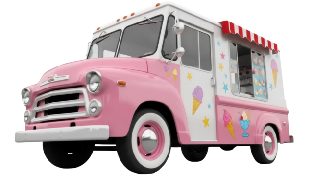 Isolated Pink Ice Cream Truck with Striped Awning ready to sell sweet treats and desserts