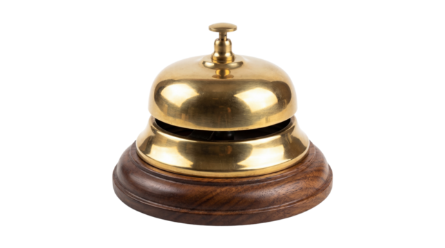 Classic polished brass service bell resting on a dark walnut wooden base on transparent background