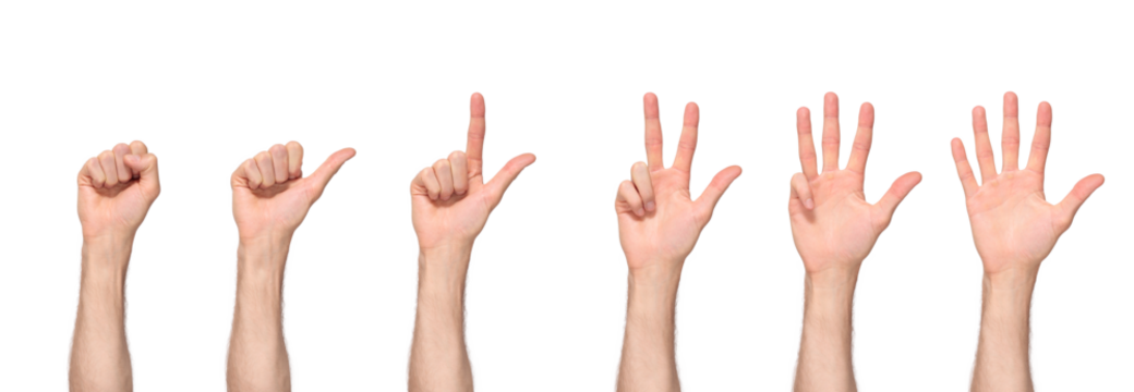 Man's hand counts from zero to five, palm facing us, isolated on transparent background, png file