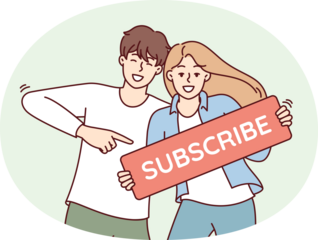 Beautiful couple of man and woman smile show subscribe sign call on viewers to action. Young family of bloggers or influencers standing inviting people to become blog followers