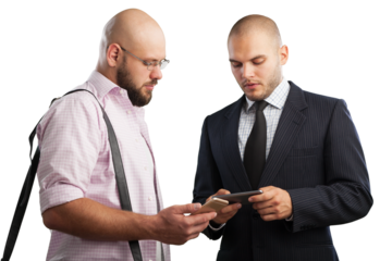 Portrait of his he her she two nice attractive lovely charming stylish trendy focused people using new gadget device isolated over vivid shine bright yellow background