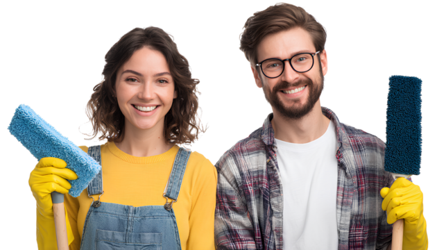Happy Couple Cleaning Windows with Squeegees on White Background