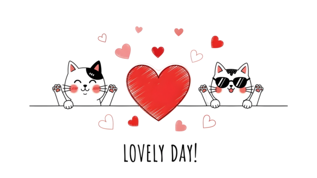 Two cute cats with a large heart and floating hearts on transparent background