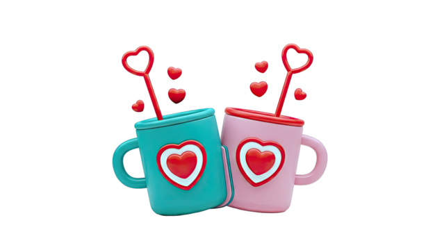 3D Two Pink Cups with Hearts and Floating Hearts on transparent background