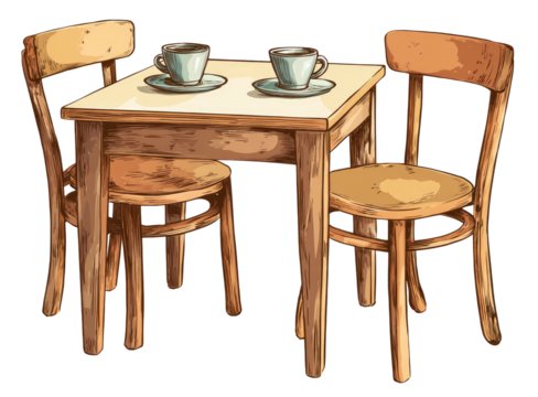 Two cartoon people having coffee and croissant at a blue table