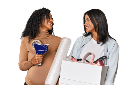 Two Latin women, one pregnant, with moving box in studio