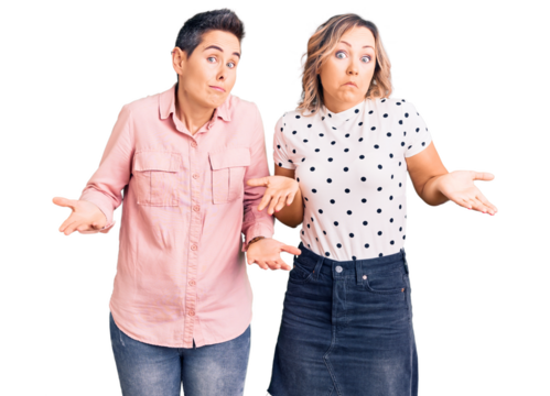 Couple of women wearing casual clothes clueless and confused expression with arms and hands raised. doubt concept.