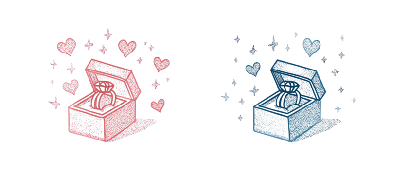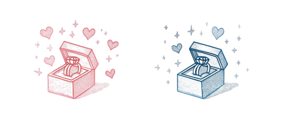 Two illustrations one pink, one blue. Engagement rings inside boxes, surrounded by hearts & sparkles