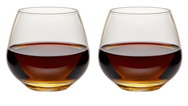 Two identical, round, clear glasses filled with dark amber liquid, set against a black background