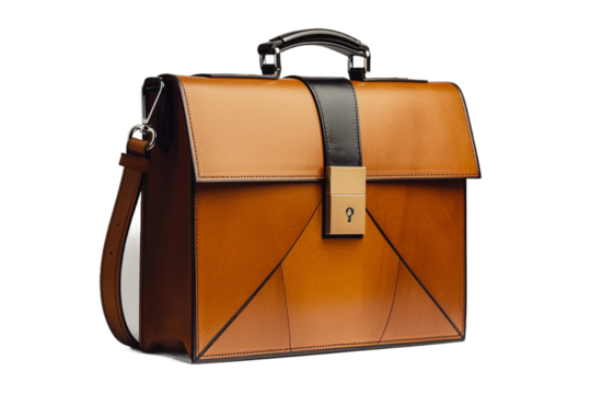 Stylish briefcase with documents isolated on transparent background.