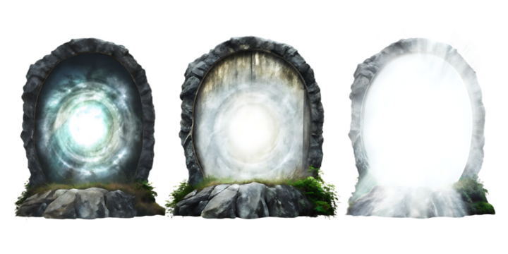 Three fantasy portals with swirling light isolated on a transparent background gateway
