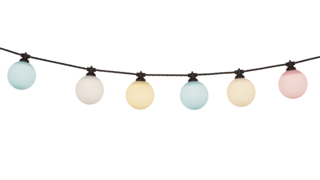 Isolated string lights with pastel globes, hanging retro party decor, decoration for backyard