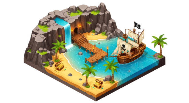 pirate cove waterfall tropical island treasure, hidden cove, isometric game asset, isolated on transparent background