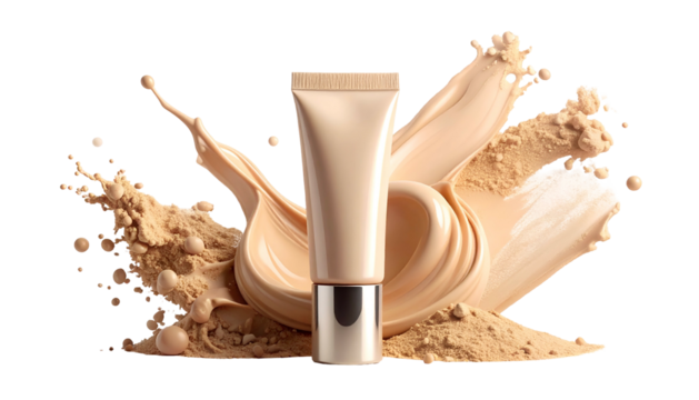 Swatch of creamy, beige foundation applied in curving strokes, glossy texture