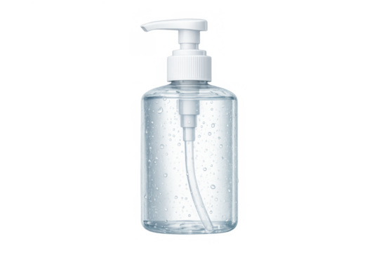 Hand sanitizer pump bottle delivering antiseptic alcohol gel for hygiene and health, clean transparent liquid disinfectant