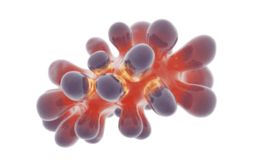 Abstract 3D render of a translucent red cell or virus with dark, glossy protrusions and an internal warm glow. background removed