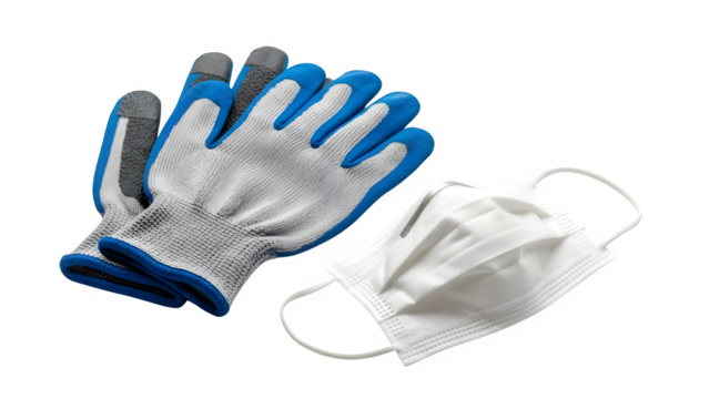 Protective work gloves and disposable medical face mask for safety and hygiene isolated on transparent background