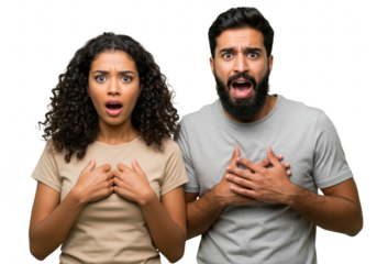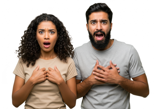 A shocked couple, a man and a woman, with wide eyes and open mouths, hands on their chests, isolated on white isolated on transparent background