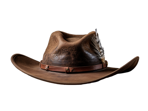 A weathered brown cowboy hat with intricate details, showcasing rustic charm and character. Isolated on transparent white background, png