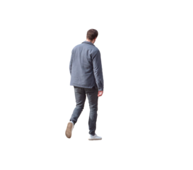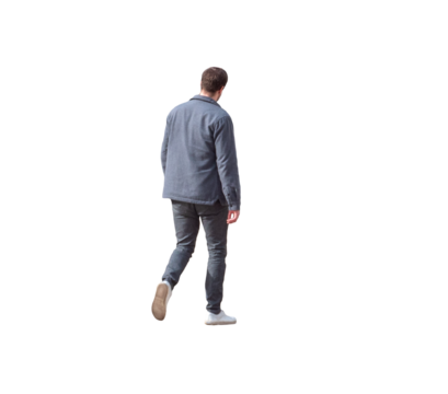 homme vu de dos marchant calmement, tenue décontractée avec veste et jean, scène en extérieur, promenade printanière