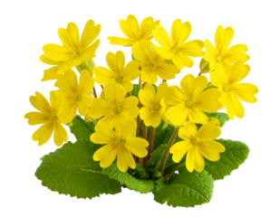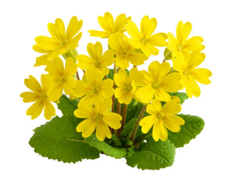 Cowslip Yellow Flower Cluster, Side Angle with Leaves, Transparent Background PNG