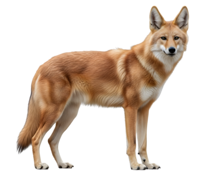 Full shot of a reddish-brown wild dog, likely a coyote or similar canid, standing upright against a plain white background.