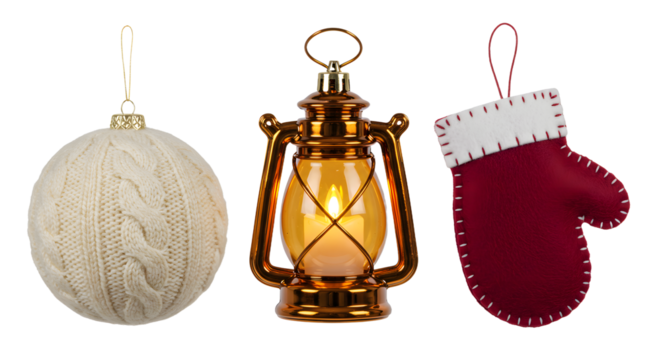 Christmas ornament ball, vintage lantern, and red mitten decoration, cozy holiday decor set for festive winter celebrations