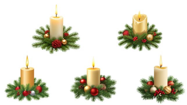 A set of various Christmas decorations, including hanging tree ornaments, balls, and ribbons, for the winter holiday season. Set of Christmas icons
