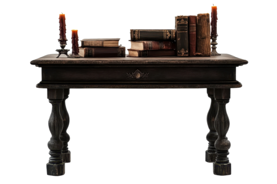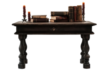 Antique wooden table with vintage books and candlelight for a cozy study ambiance