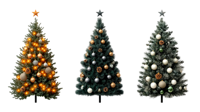 Png of Three beautifully decorated Christmas trees featuring unique ornaments and lighting on transparent background.