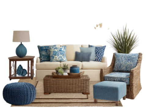 Cozy coastal living room furniture with a cream sofa wicker armchair blue patterned cushions and a natural fiber rug.