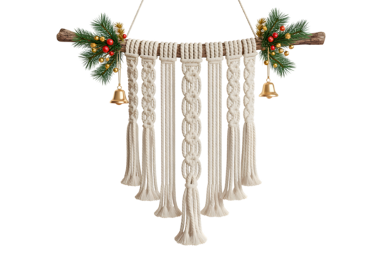 Beautiful Christmas macrame wall hanging, festive holiday decor, pine branches, red berries, golden bells, cozy winter aesthetic, celebration background, handmade craft, natural elegant style