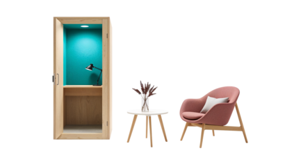 Modern workspace interior featuring a cozy phone booth, chair, and minimalist table isolated