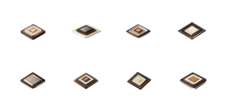 Collection of eight isometric electronic microchip integrated circuits showcasing various processor designs on transparent background