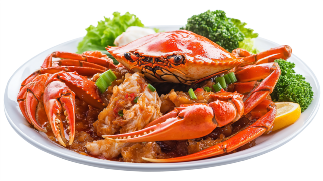 Seafood dish, steamed and cooked blue crab on white PNG File.