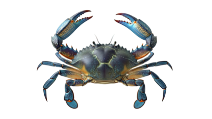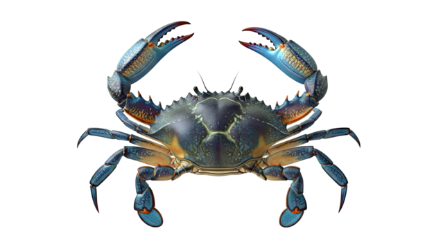 Blue crab relaxing on sandy terrain, transparent backdrop revealing intricate shell texture and marine ecosystem characteristics
