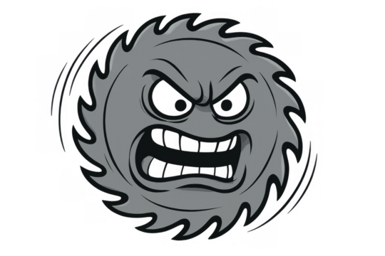 Angry spinning saw blade cartoon character on transparent background portraying danger and warning