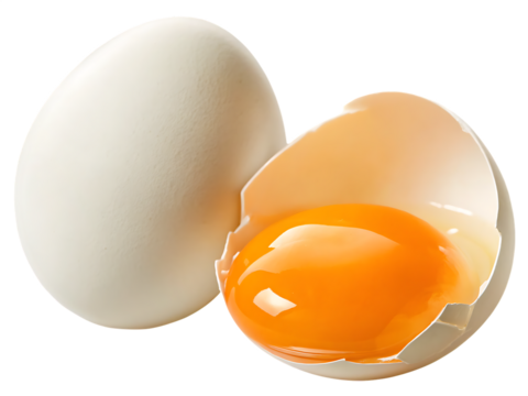 whole egg and cracked egg with yolk isolated on a white background PNG, ai generated
