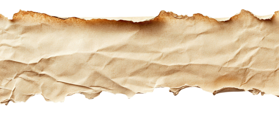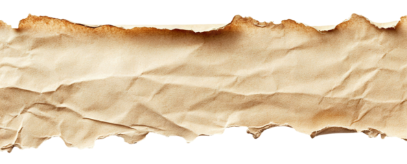 Crumpled torn strip of kraft paper with rough edges, isolated on transparent cutout background