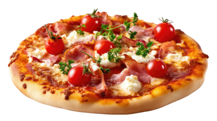 Deliciously crafted gourmet pizza topped with fresh ingredients showcasing a mouthwatering culinary masterpiece on a rustic wooden board