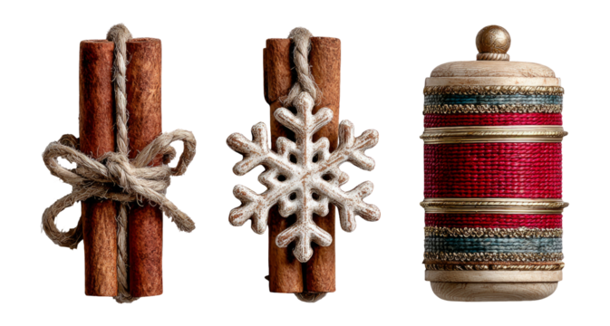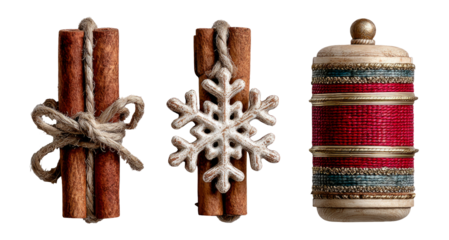 Isolated Cinnamon Sticks and Decorative Winter Ornaments on White
