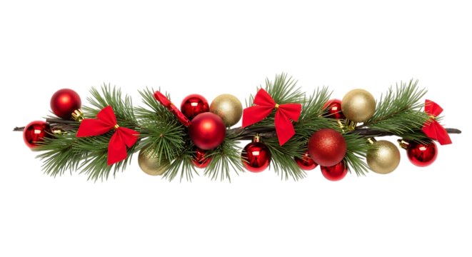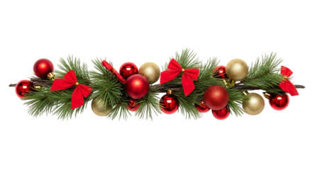 Festive christmas garland isolated on transparent background featuring vibrant red bows, shimmering gold and red baubles, and lush green pine branches, creating a joyful and celebratory holiday decora
