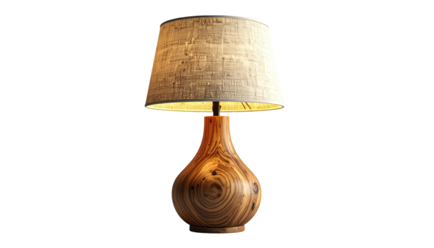 Illuminated wooden table lamp with a patterned lampshade, showcasing a warm ambiance against a deep black backdrop, casting soft light on the natural wood grain details, evoking a sense of...