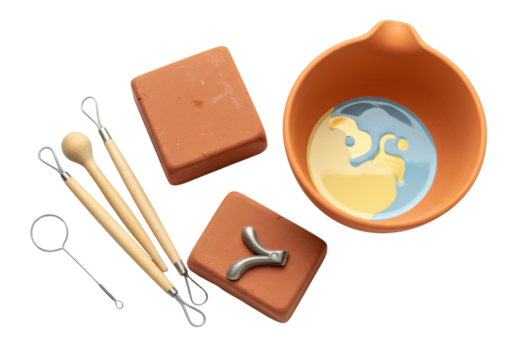 Isolated ceramic pottery tools and clay blocks, artistic craftsmanship items, ready for modeling