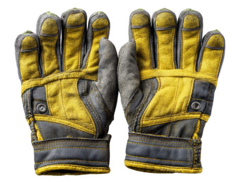 Close-up view of a pair of yellow work gloves with protection. Isolated Transparent Background, PNG