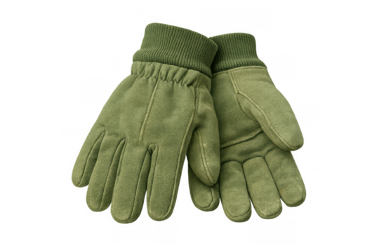 Pair of olive green suede work gloves protecting hands during outdoor activities or winter weather, isolated on transparent background