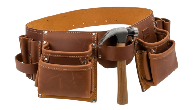 Brown leather tool belt with pouches and a hammer for construction, cut out, stock png, isolated on transparent background