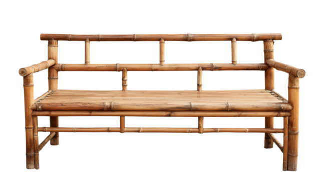 Rustic bamboo bench made from natural bamboo poles, unique craftsmanship and organic curves transparent png background. Ai generated